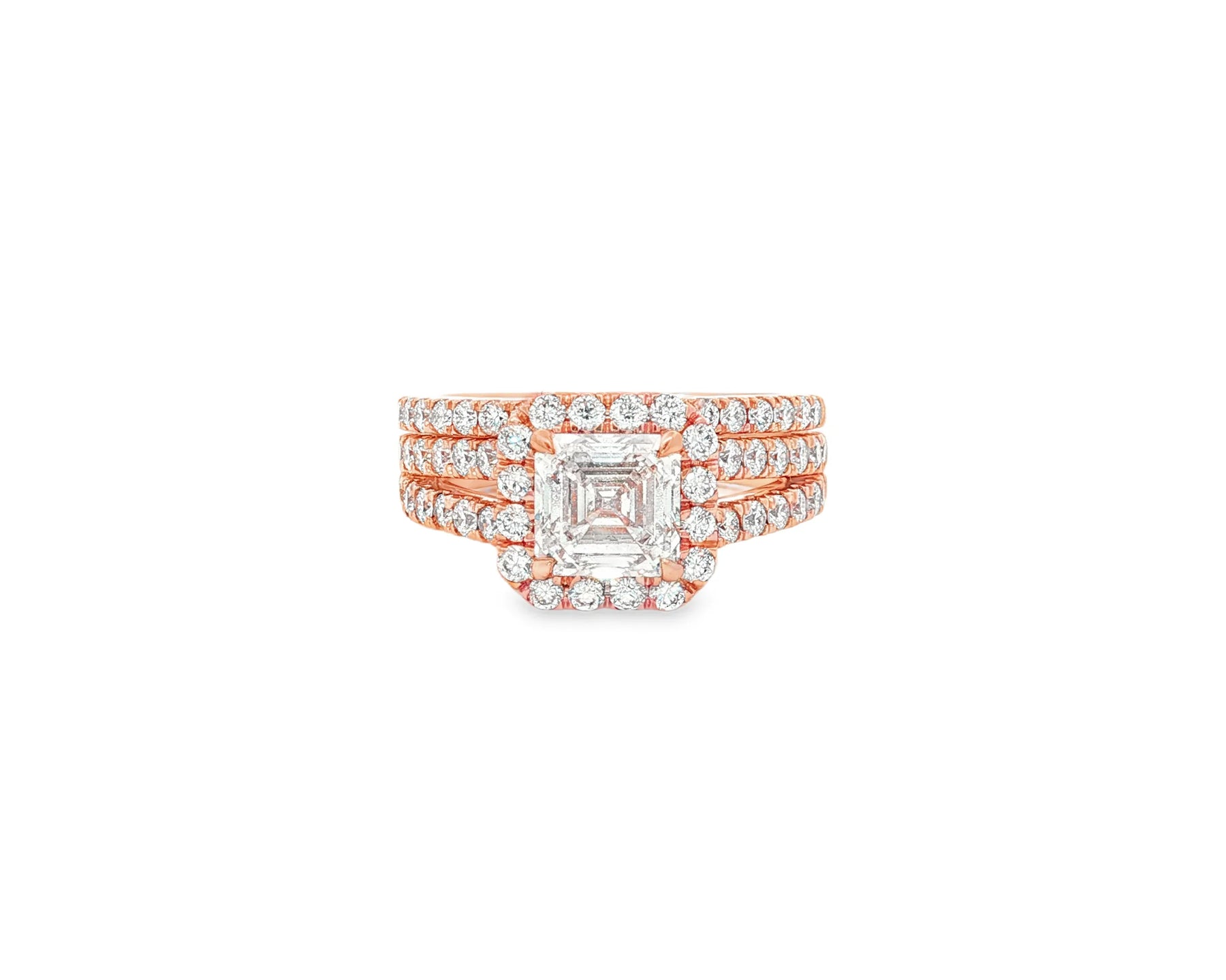 Available inrose, yellow, and white gold, this handcrafted ring set blends classic emerald-cut elegance with modern detailing for a striking, high-end finish.