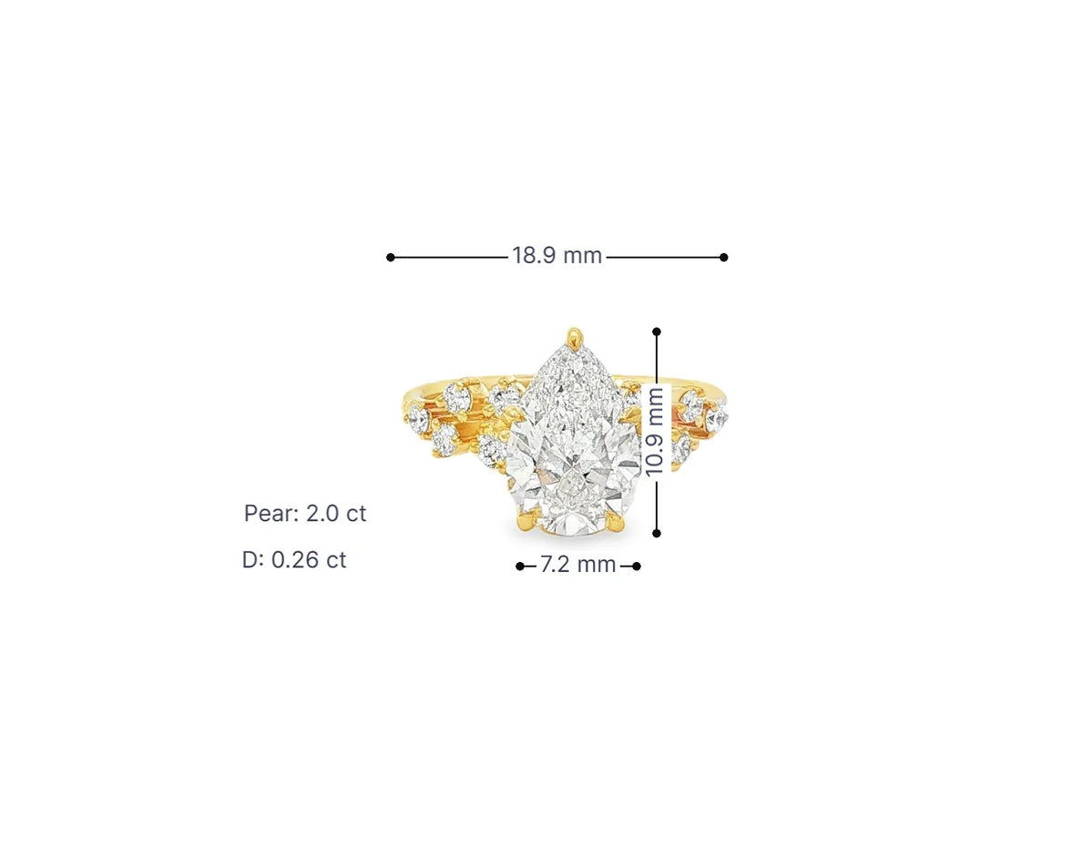 This exquisite engagement ring highlights a striking pear-shape diamond center, beautifully complemented by a cluster of round brilliant diamonds that cascade along the band for added dimension and sparkle. Crafted in 14k gold with a total diamond weight of 2.26ct, the design features a refined balance of a 2.0ct pear center and 0.26ct of round accents, offering exceptional brilliance from every angle. The ring weighs 2.86 grams of solid gold and showcases premium D-color diamonds with VS1 clarity, ensuring superior radiance and remarkable purity. Measuring approximately 18.9 mm in width, 10.9 mm in height, and 7.2 mm across the center stone, it delivers an elegant yet impactful presence on the hand. This piece is available in white, yellow, and rose gold, making it customizable to different personal styles. Finished with artisanal craftsmanship, the ring embodies a luxurious, feminine, and captivating aesthetic—ideal for a timeless engagement proposal. This ring features a 2.00ct pear-cut center stone paired with 0.26ct of accent round diamonds.