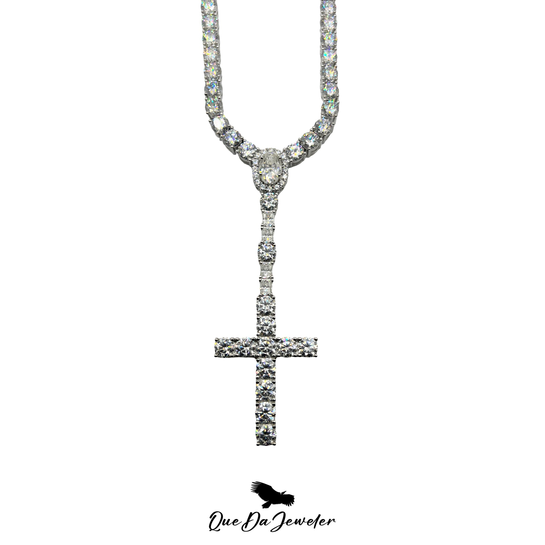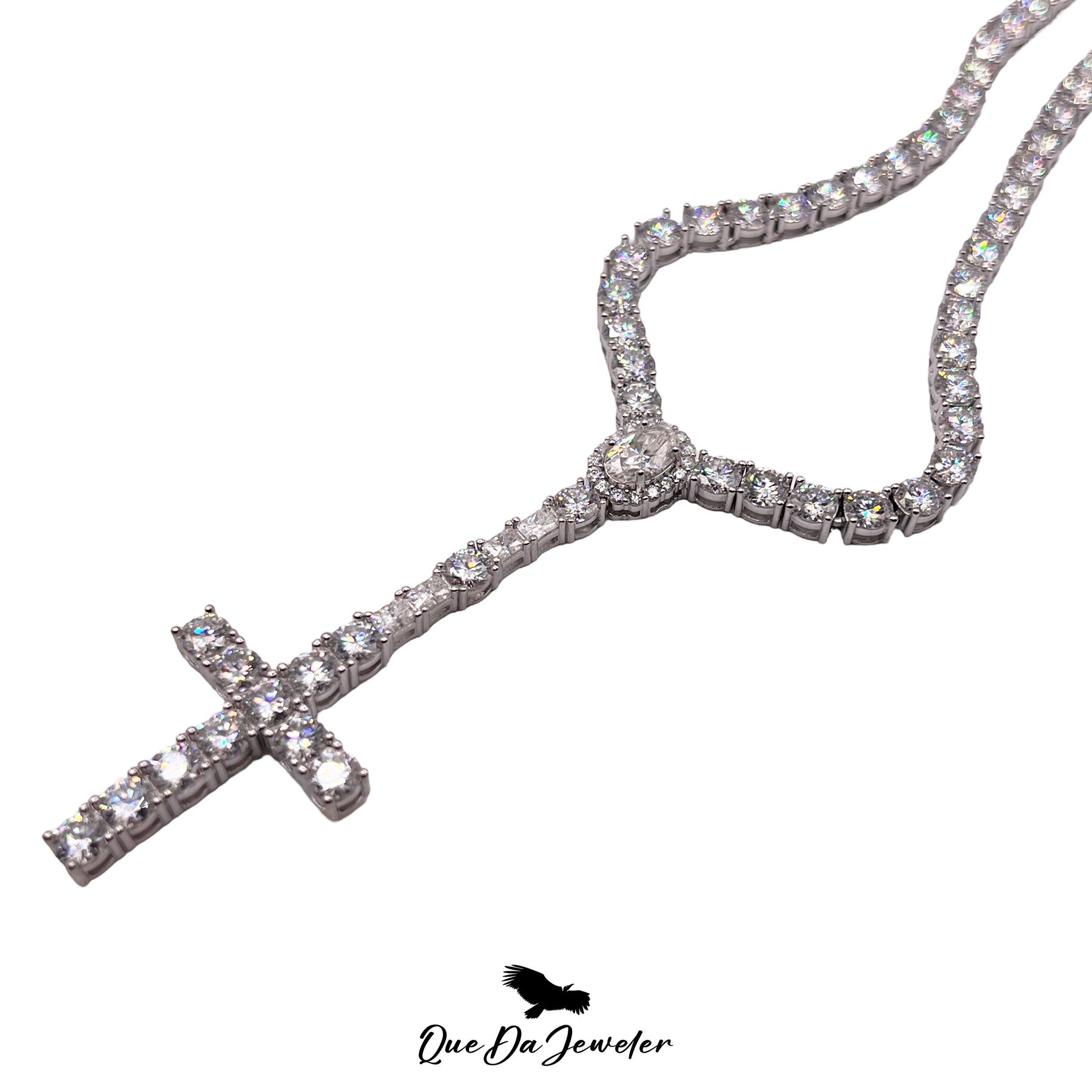 This rosary-style cross chain blends spiritual elegance with high-end craftsmanship. The centerpiece features a striking 3ct oval stone that draws immediate attention, complemented by a beautifully detailed cross set with both round and emerald-cut stones for added depth and brilliance. The chain itself is a 5mm VVS moissanite tennis design, crafted from .925 sterling silver and finished with durable 14k gold plating for a rich, non-tarnish shine. With its radiant sparkle and meaningful design, this piece delivers a perfect mix of luxury, symbolism, and standout style.